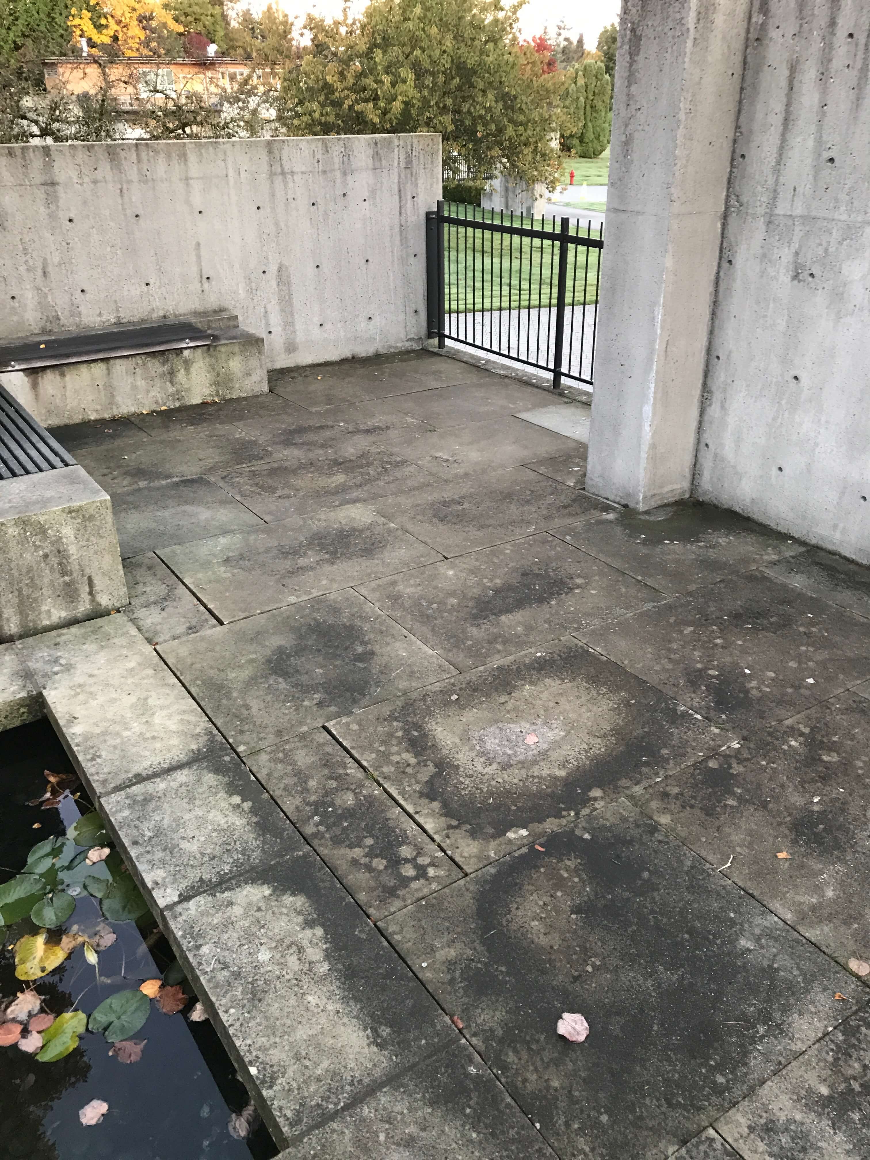 The andesite stone face was very porous, and with the long-wet climate that they have in Vancouver, there were a lot of algae forming. This algal growth created a slipping hazard: when the stones were wet, they were as slippery as ice. An additional challenge to this job was that the pathway was beside fish ponds, therefore no chemicals could be used. The owners had tried different biological cleaning products in previous years, however none was successful in cleaning the stone.