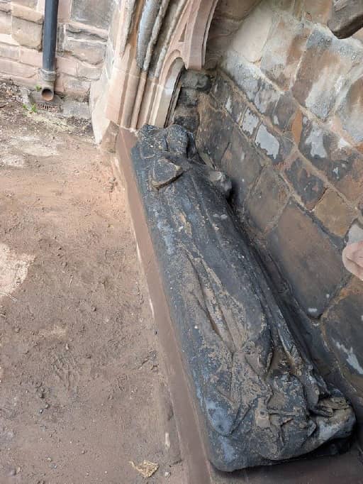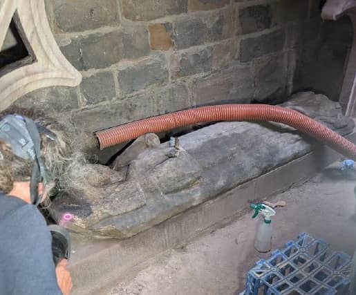Corrine Jackel Conservation were set the task of testing the effectiveness of the laser cleaning on an external effigy and its surrounding masonry. The effigy had subtle traces of lichen and carbon staining caused by pollution from her time spent enduring the elements.